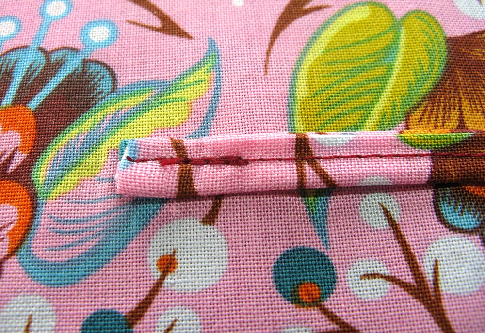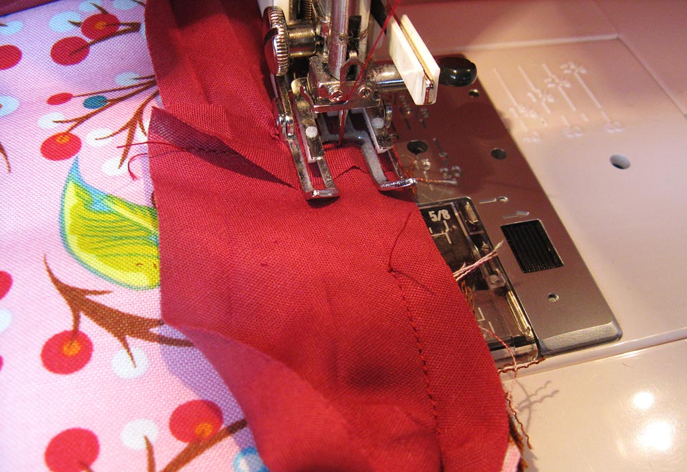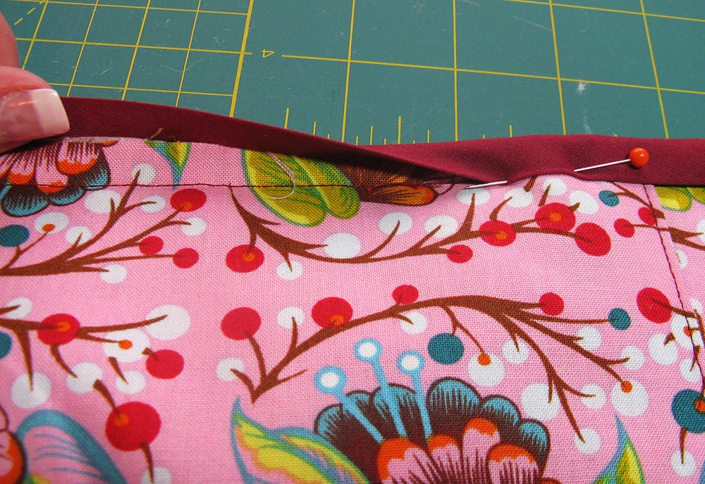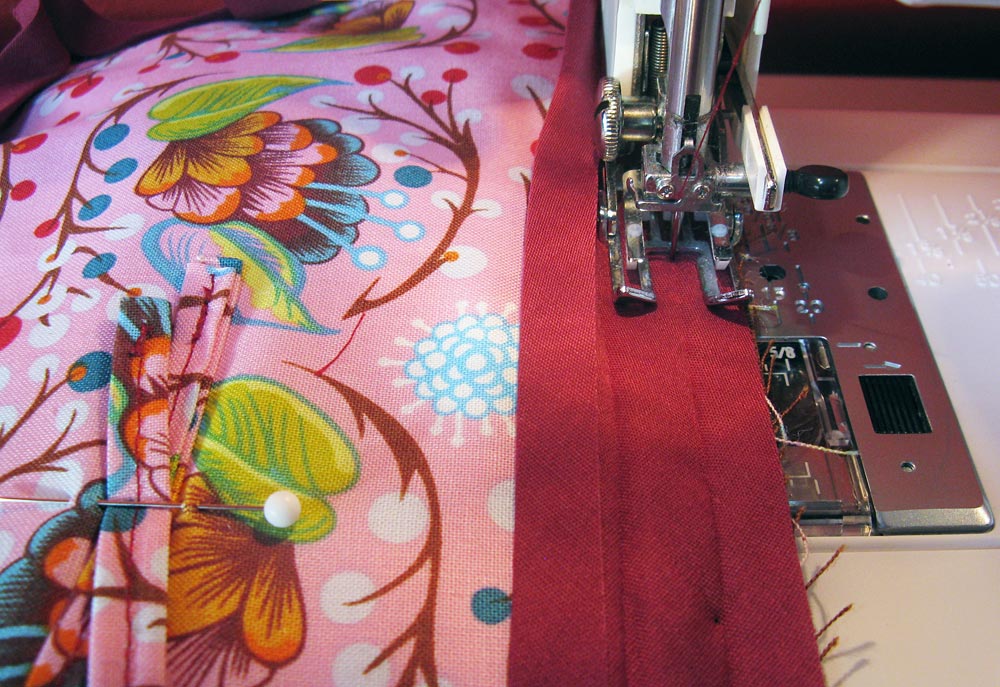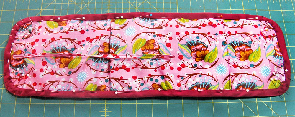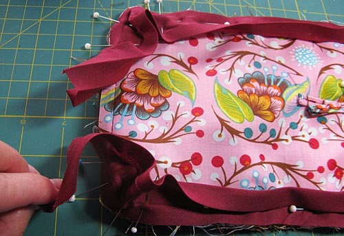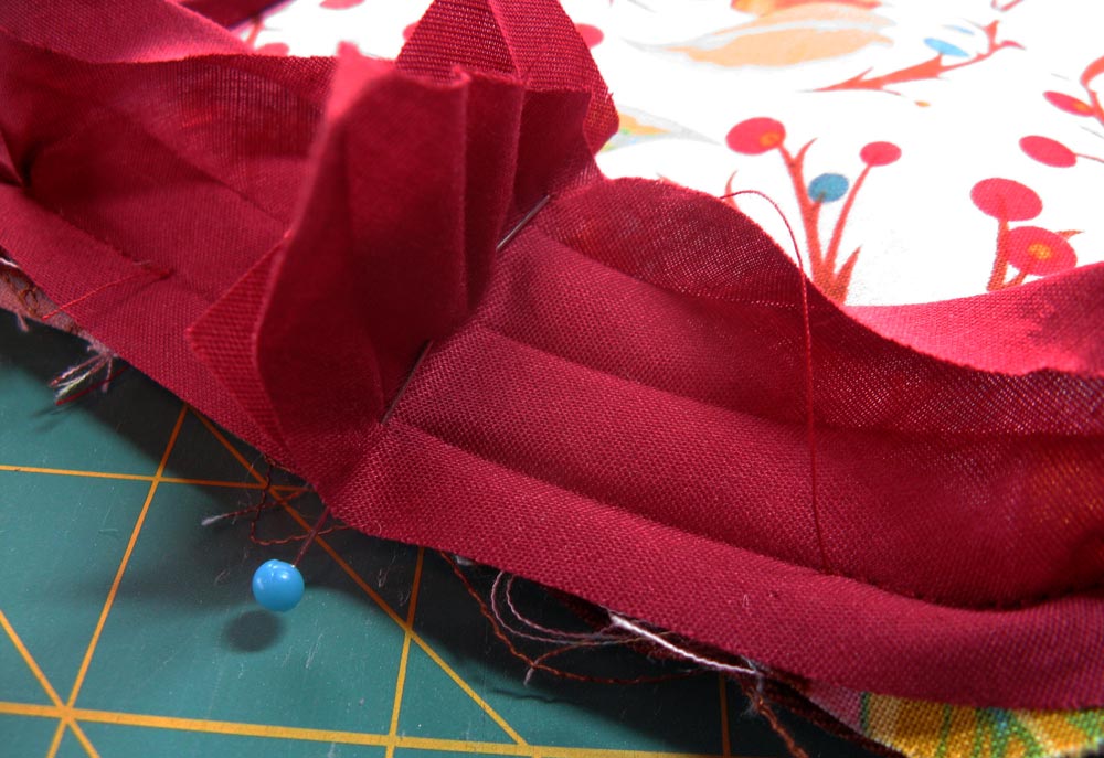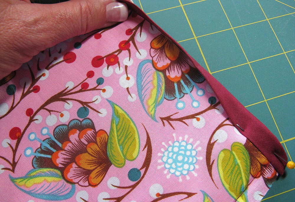 - Don’t be afraid to take a little time to futz with the rounded corners and feel free to use a lot of pins. The bias binding is made to curve… you just gotta work at it a little.