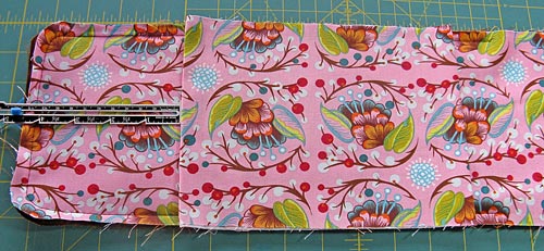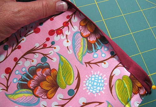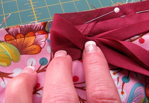 - Make sure your fold is even all around the edge. Again, you may need to futz with the rounded corners a little bit on the back to make sure they lay just right. Pin well!