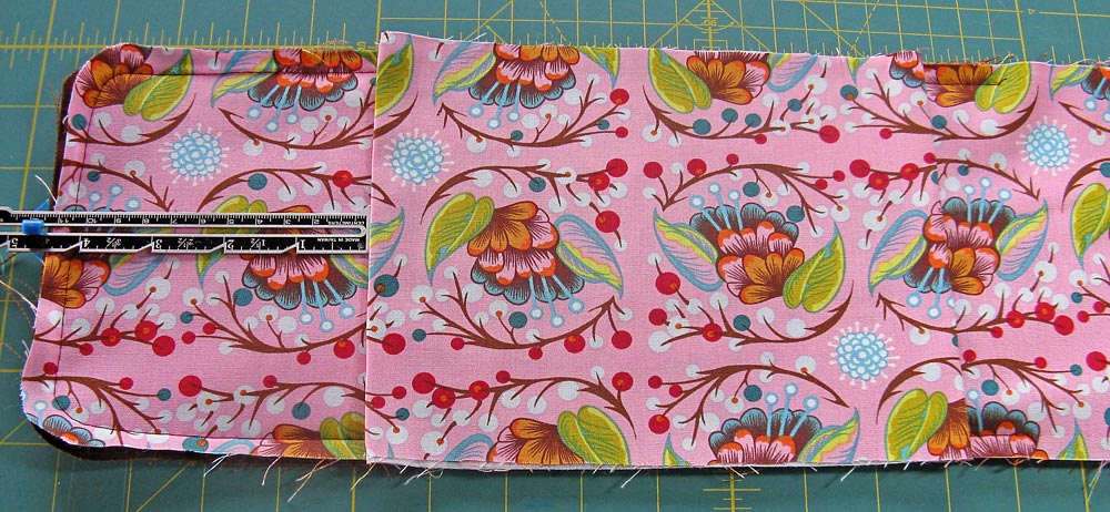- Place the pocket on the print side of the main case layered piece. The bottom is the seamed edge; the top is the folded edge. The bottom seamed edge should be placed approximately 4″ from the bottom raw edge of the main case layered piece. This is approximate because if you have fussy cut your pocket to match your fabric, you may need to slide it up or down slightly to get a good match, but try to stay close to the 4″ from the bottom mark.