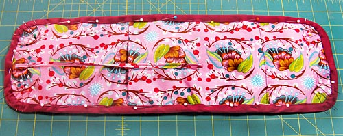 - Start pinning at the bottom. Leave about a 2″ of binding tail loose at the beginning, then continue to pin all the way around the case, stopping about 2-3″ from your starting point and leaving another 2″ tail.
