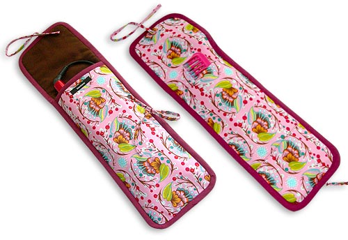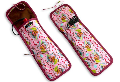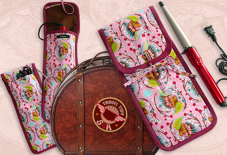 Don’t know about you, but when I travel, not matter how organized I try to be, I’m always hurrying to finish packing my toiletries and make-up. I’m also usually trying to fix my hair at the last minute, which means there sits my flat iron… too hot to pack! This gave us the idea for today’s accessory: the hot tool case. It contains two hidden layers of metalized thermal batting. It looks pretty from the outside and is protective from the inside, so you can pack your curling or flat iron while warm… and still catch your plane on time! It’s also great for your gym bag.