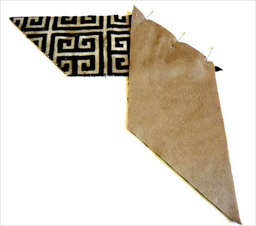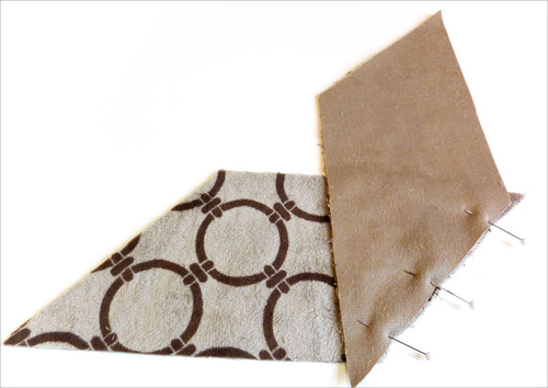- Place each pair right sides together, aligning along the angled ends. The two lengths of the fabric will form a right angle, and at the seam line, the points will extend beyond the straight edges by ½”. This is similar to how you stitch together strips of bias binding. Pin in place.
