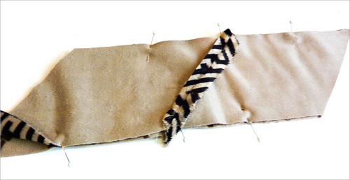 - Fold the outer ends out of the way and place the innermost ends right sides together. Pin in place. As above, the angled ends will extend ½” on each side.