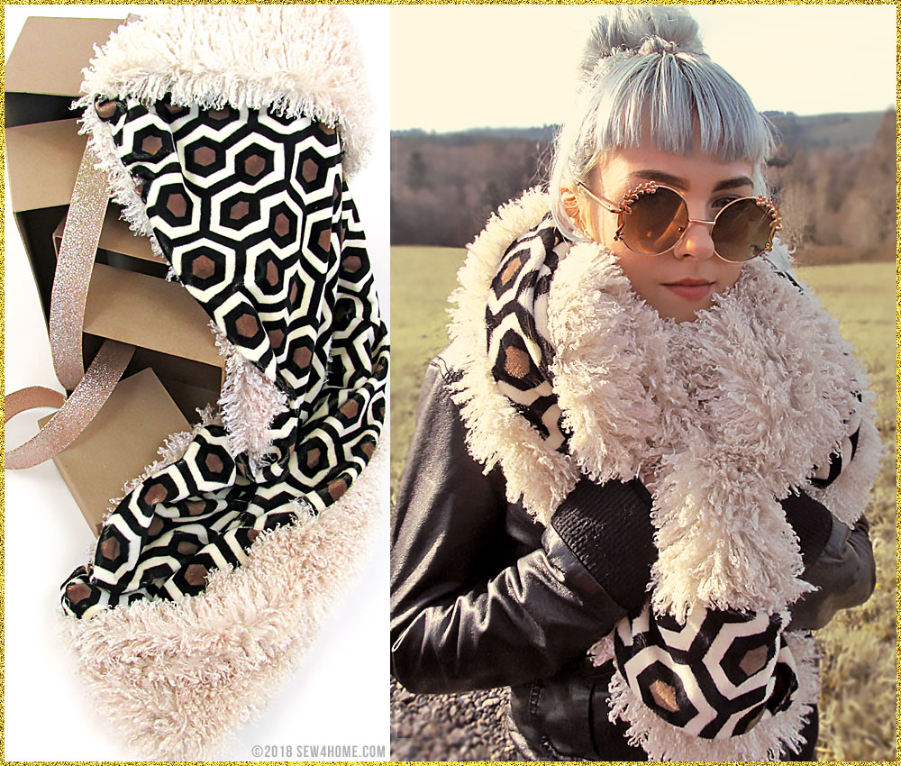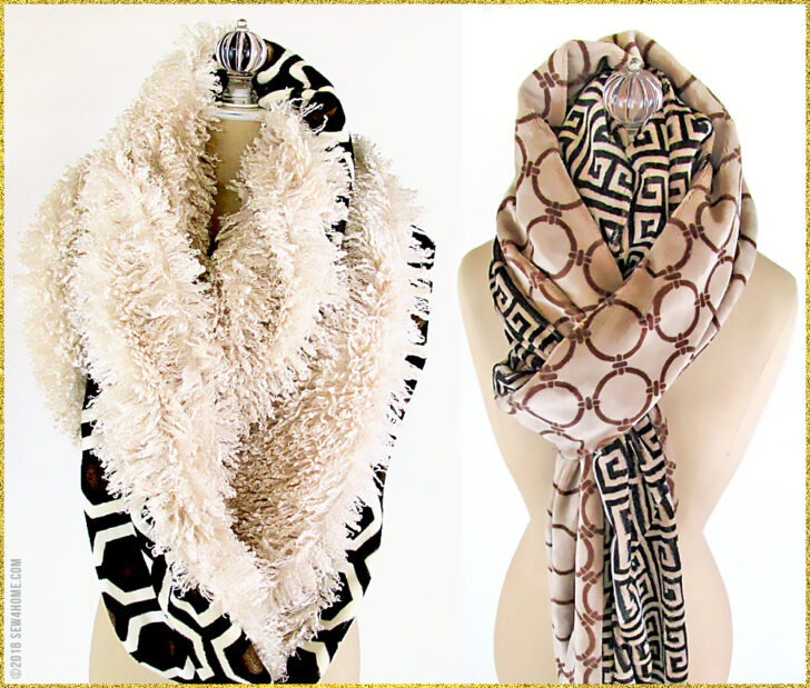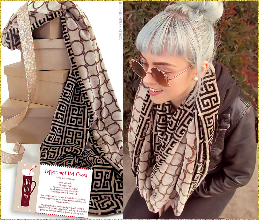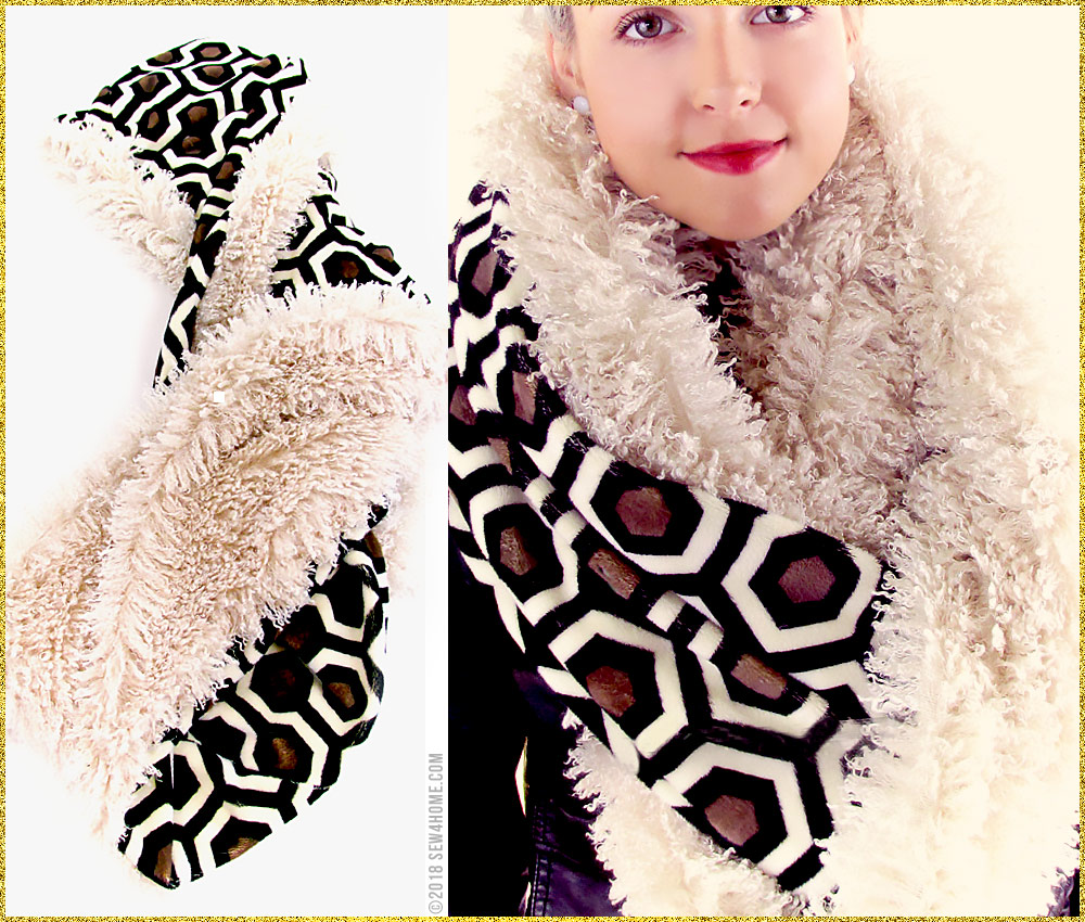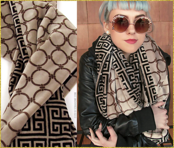 Soft and warm – the two just go together. So that’s just what we did! Our double-sided infinity loop scarf is super fast and fun. And, with so many great options in both fleece and faux fur, you can bundle up everyone on your gift list. We used two printed, super cuddly fleece fabrics for one scarf. On the other, we combined a printed fleece with a faux fur that mimics curly llama. Both pairings are silky soft with a fluid drape that begs to be wrapped up tight.