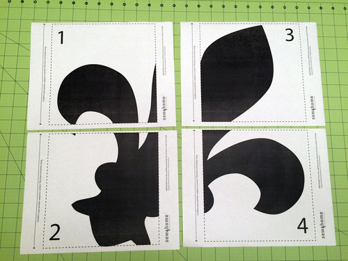 NOTE: You’ll notice the very bottom of the Fleur-de-lis image runs off the template. This is on-purpose. The template will be positioned so this part of the design is hidden in the seam. Sizing it as we did allowed us to create just four template pieces, each able to print on a standard 8½” x 11″ sheet of paper.