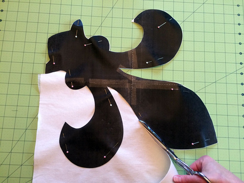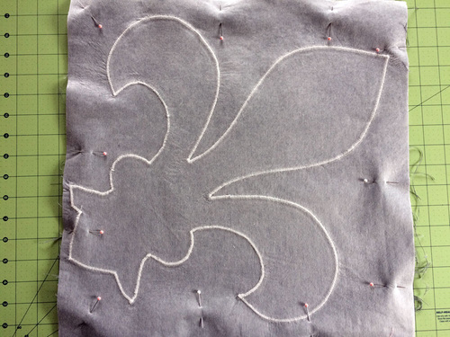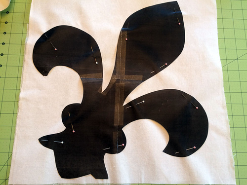 - Pin the trimmed Fleur-de-lis template to the right side (the non fused side) of the appliqué fabric, making sure you are within the fusible web area.