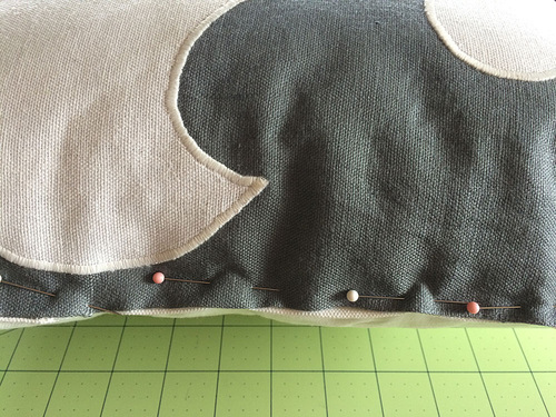 - Pin the pillow front and back right sides together, matching all raw edges. Leave an approximate 6″ opening along the bottom edge for turning and inserting the pillow form.