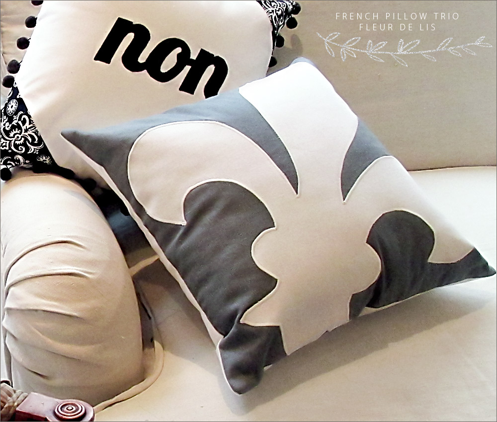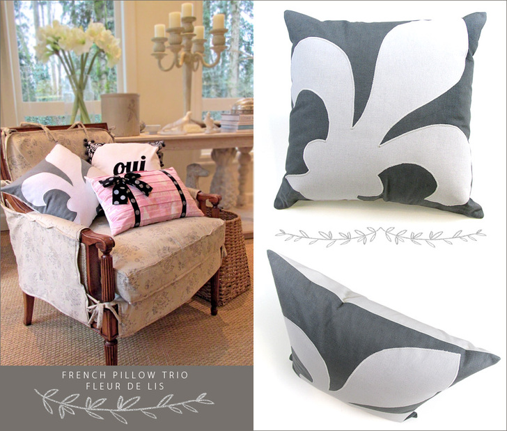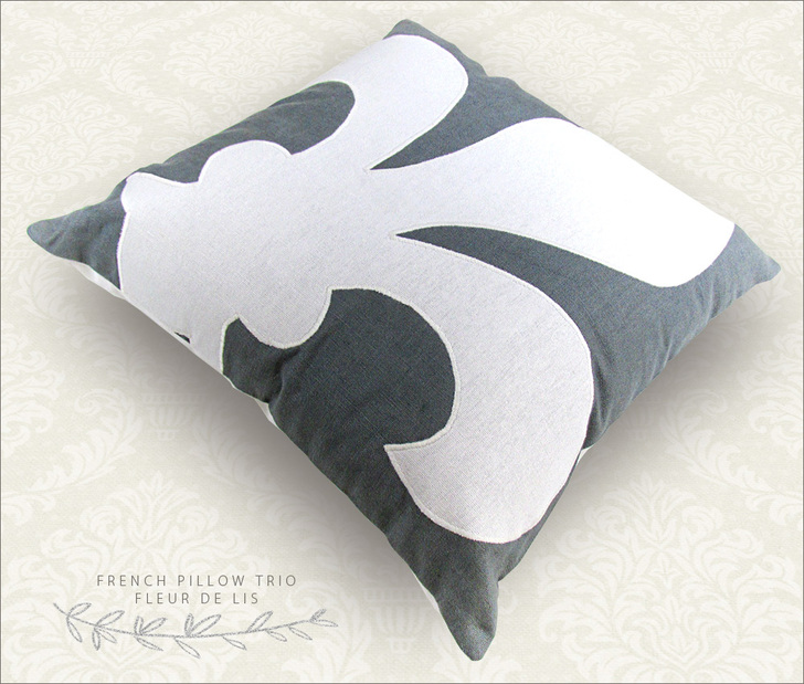 This dramatic pillow with its bold fleur-de-lis design is what is traditionally called a “statement” pillow; it’s the member of a pillow grouping with the strongest flair, the one that anchors the collection. Although instances of the fleur-de-lis floral emblem have been found as far back as the third millennium BC, it is most strongly connected to French royalty as of about the 12th century and is said to signify perfection, light, and life. We use it on our pillow as a grand appliqué in a warm charcoal and milk white color combination.
