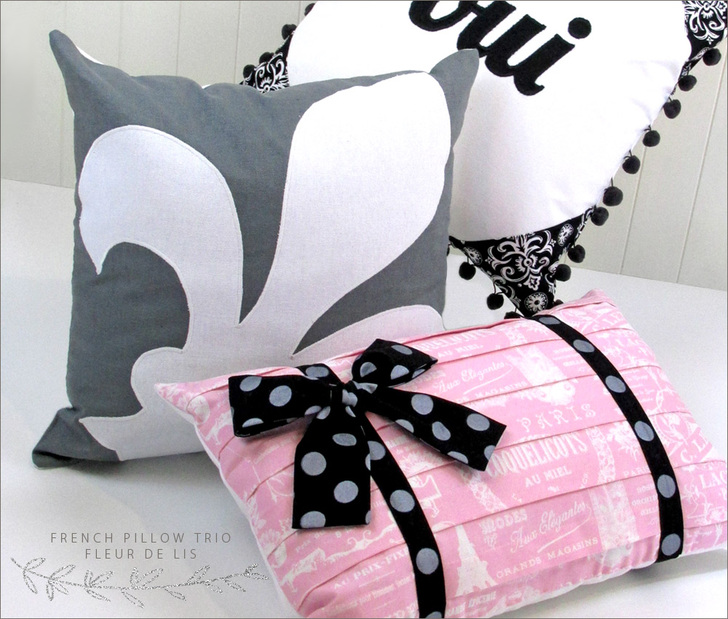 We originally created this as part of a trio of shabby chic pillows done in a French style. You may also like the whimsical word pillow with its fun accent poms. It’s reversible; use it to display your mood: “Oui” – “Yes! it’s a great day.” or “Non” – “No, perhaps you should sit this one out.” Then, add the striking rectangular pillow that features a lovely pleated front embellished with thin belted accents and a sweet bow.