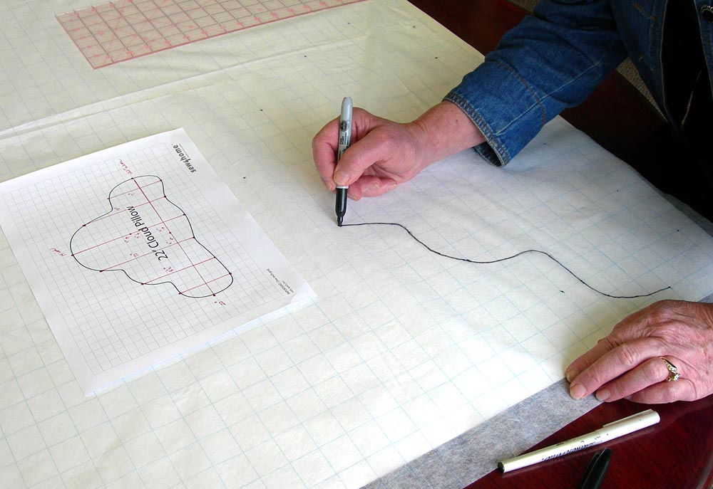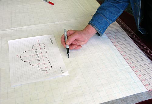 - Draw one horizontal and several vertical lines on your template as guides for your transfer points. We drew a horizontal base line at the widest part of the pillow (22″ in this sample), and then we drew six evenly spaced vertical lines. Make sure you are drawing on the actual grid lines so you can easily count the number of squares from point to point.