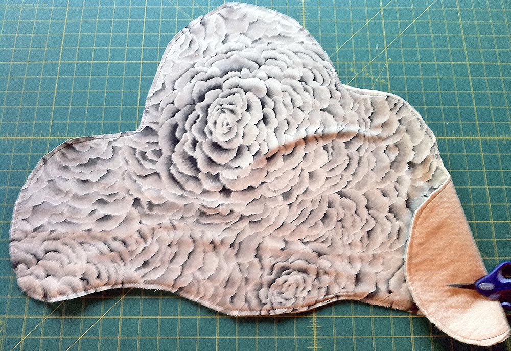 - Make sure the fabric and the batting layers are nice and flat and flush around all the curves and edges. Pin together. The batting should be against the wrong side of the fabric.