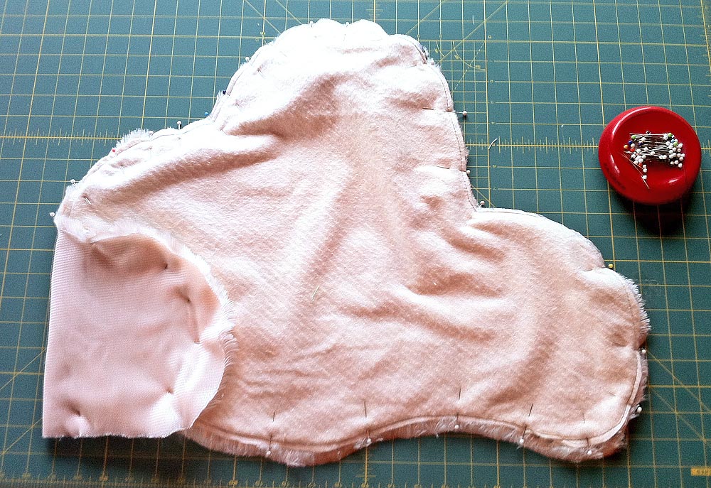 - Layer the assembled cloud back and the cloud front right sides together and pin together all around, leaving an approximate 4″-5″ opening along the bottom edge for turning and stuffing.