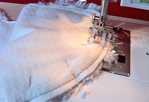 NOTE: As above, I stitched all the way around, removed the project from under the needle and inspected my seam. Sure enough, even with all my careful pinning and a special foot and slow-going, I had still managed to miss a few spots. No worries, no tears. This is a very forgiving shape. I simply put the project back under the needle, this time with the Minky side up, and picking a starting point where the seam was true, I dropped my needle into the seam, then blended out of this seam line, curving as necessary to catch the missed section, finally curving and blending back into the “good seam” at the other side. - Trim your finished seam back to approximately ¼” all around except at the opening. Leave the raw edges of the opening ½”. Clip the curves slightly, being careful not to cut through your seam line.