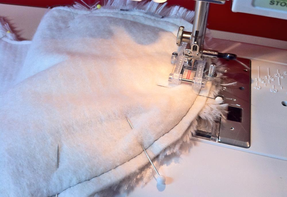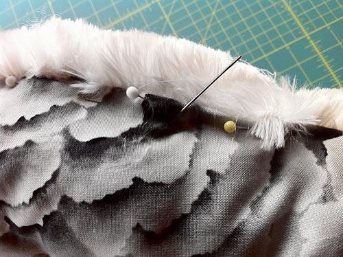 NOTE: This is an important step. Take your time to line up the layers. If you decide to use Minky Eyelash as we did, you need to be very careful you are actually pinning the backing of Eyelash and not accidentally catching just the fleece fibers. Check your pinning from both sides to be sure you’ve securely caught the edges all around. The Minky Eyelash fibers will stick out a bit from the raw edges. - Stitch together, using a ½” seam allowance and back-tacking at either side of the opening. I used my Janome Rotary Even Foot attachment and sewed with the Minky side against my feed dogs. Both these steps helped me keep these rather slippery layers from shifting.