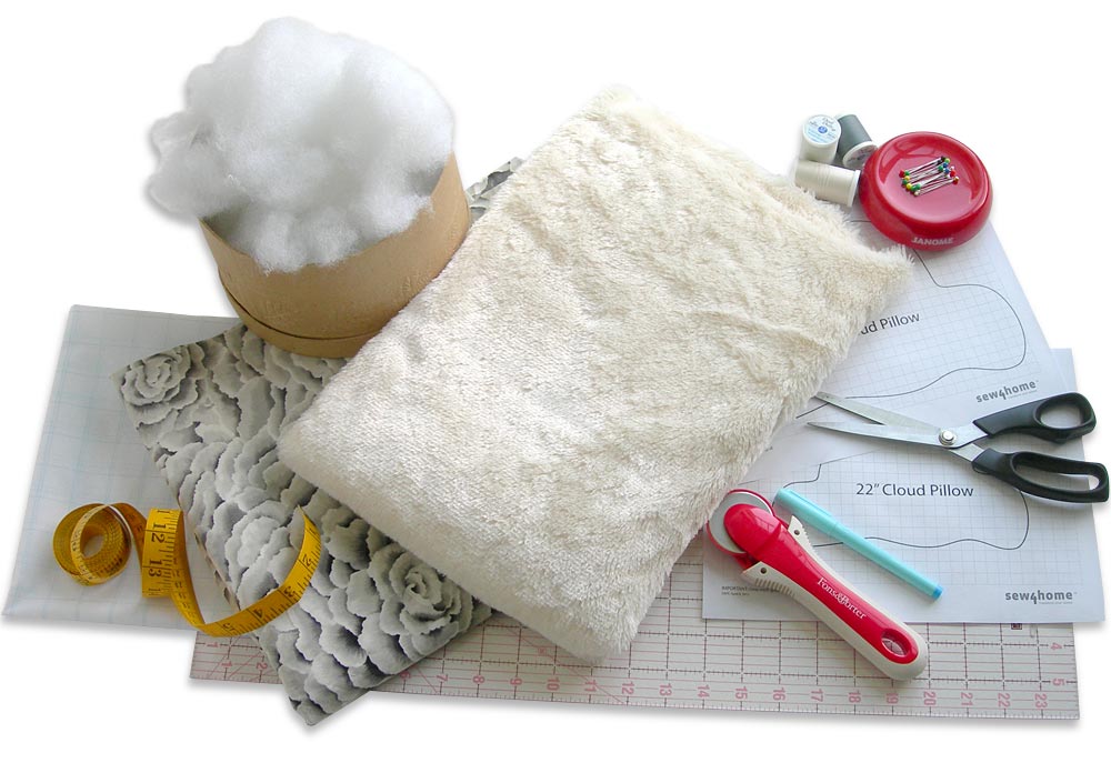The supplies shown below are enough to make two cloud pillows, one large (30″ base) and one small (22″ base).