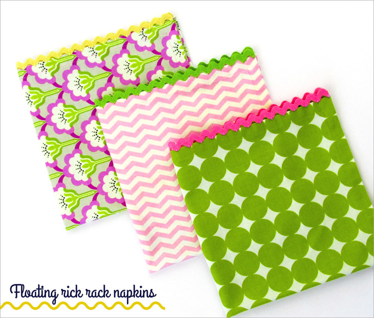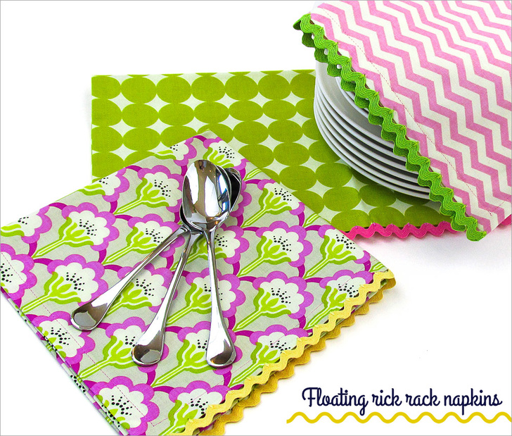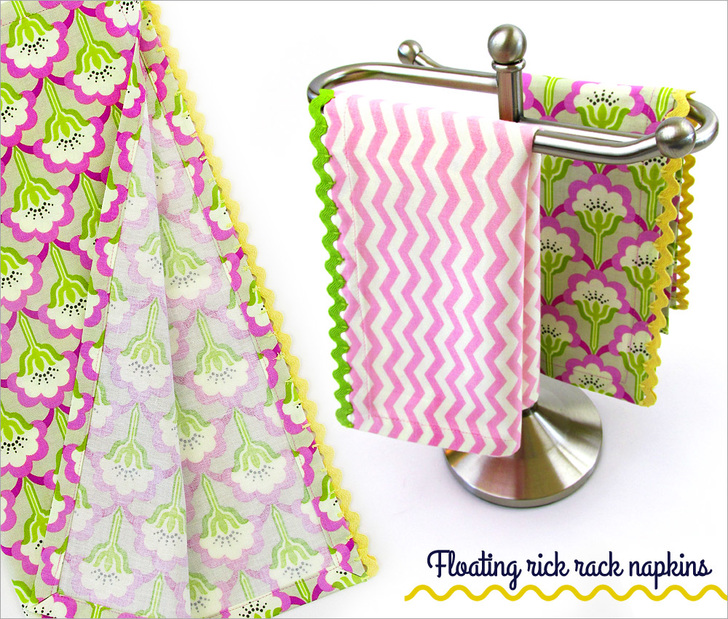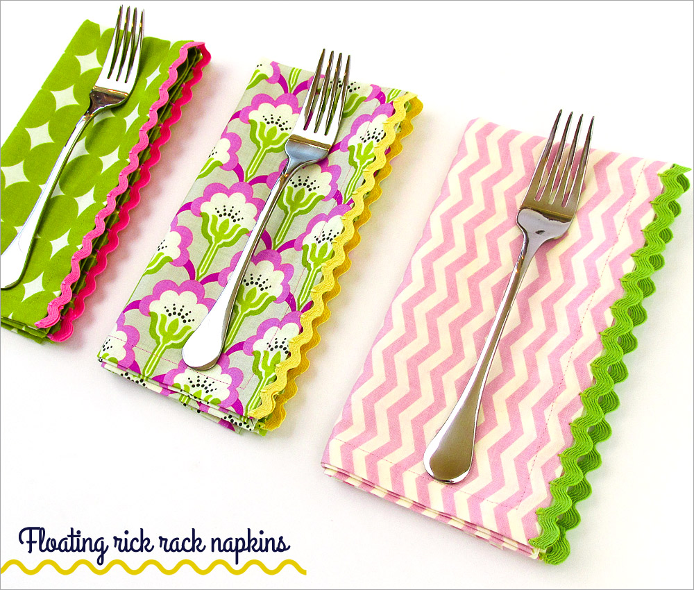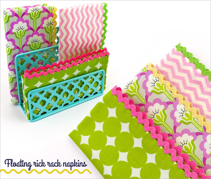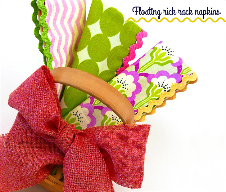 Did you know the paper napkin made its debut in 1887? While that’s quite historically interesting, we still prefer the cloth napkin. This pretty floating rick rack technique allows you to fancy-up a standard cloth napkin for a gift, a party – or just for everyday. It’s fun and easy, and you may already have everything you need on hand to whip up a stack in no time.