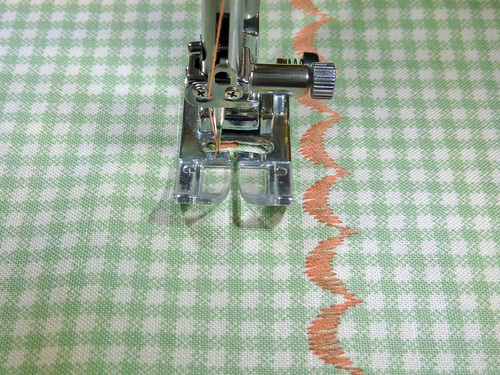 - Re-thread the machine with the accent thread in the top and bobbin. Attach a Satin Stitch foot or similar if desired. Re-set the machine for a decorative stitch to exactly match what you used on the bib.