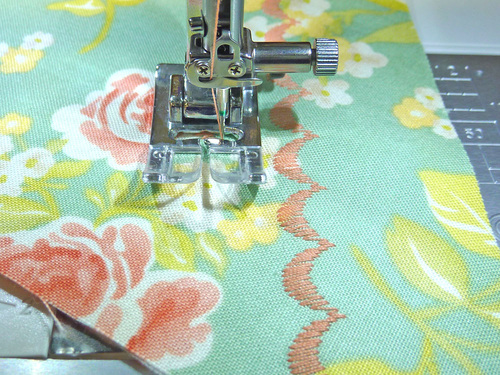 - Thread the machine with the accent thread in the top and bobbin. If you wish, attach a Satin Stitch foot or similar. We opted to stay with our standard presser foot. Adjust the stitch width to its maximum. We used 9mm.