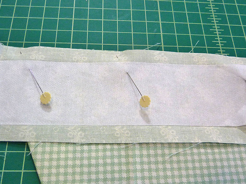- Lay an interfacing strip on the wrong side of each front tie strip. Following manufacturer’s instructions, fuse in place.