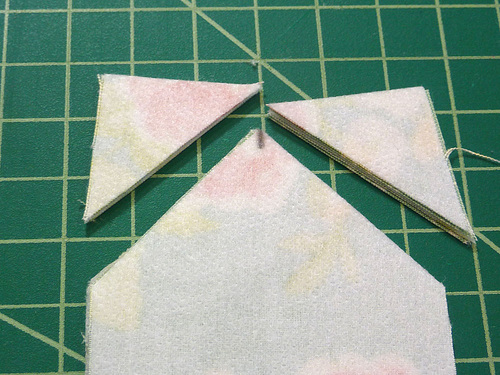 - Using a ½” seam allowance, stitch together the layers of each pair. Remember to leave the straight cut ends open, and to go slowly around the point, stopping and pivoting at all the angles.