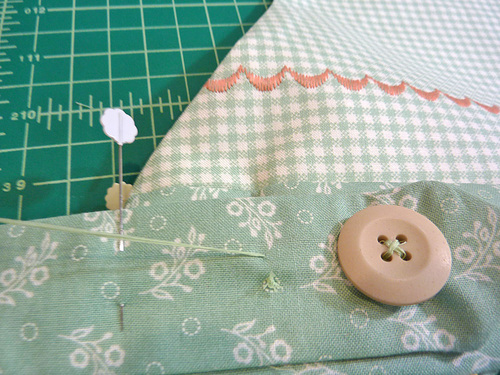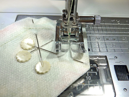 - The second button should be approximately ¼” from the first. Because you are sewing through all the layers, make your stitches very precise and neat. Hide the knot of the thread under the button by taking a stitch in place prior to laying down the button.