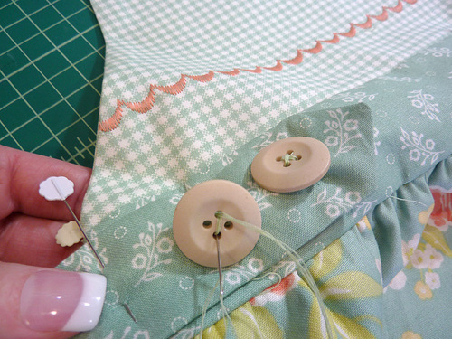 Classic wooden buttons secure the straps to the bodice and the ties at the waistband. There are no buttonholes; you simply hand stitch the buttons through all the layers.