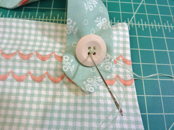 - Repeat to stitch each shorter neck tie in place. The points of these ties should sit approximately 2¼” down from the top of the bib. The outer edge of each tie should sit approximately ½” in from the side edge of the bib. Hand stitch each neck tie in place with one button centered within the point as shown in the photo below.