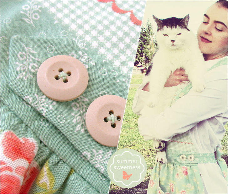 Celebrate the sweetness of warmer weather with this lovely sweeping skirt apron. A nine-part pattern is offered below to create the beautiful bottom curve, the angled bodice, and the cute pockets. For our special finishing details, we added just the right touch of decorative stitching and used buttons to secure the ties. Slipping on this beauty will bring summer sunshine and flowers right into your kitchen.