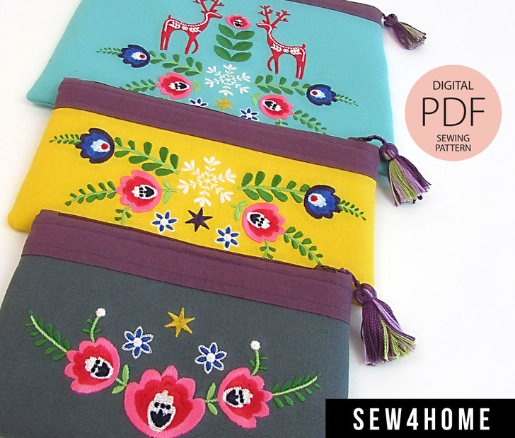 We have continued to keep the cost of our Etsy Shop patterns affordable, while maintaining the professional, thorough instructions and the gorgeous sample photography we’ve become known for throughout the sewing and craft industry. This full Zip Pouch pattern set, including the three custom embroidery designs, is just $6.95.