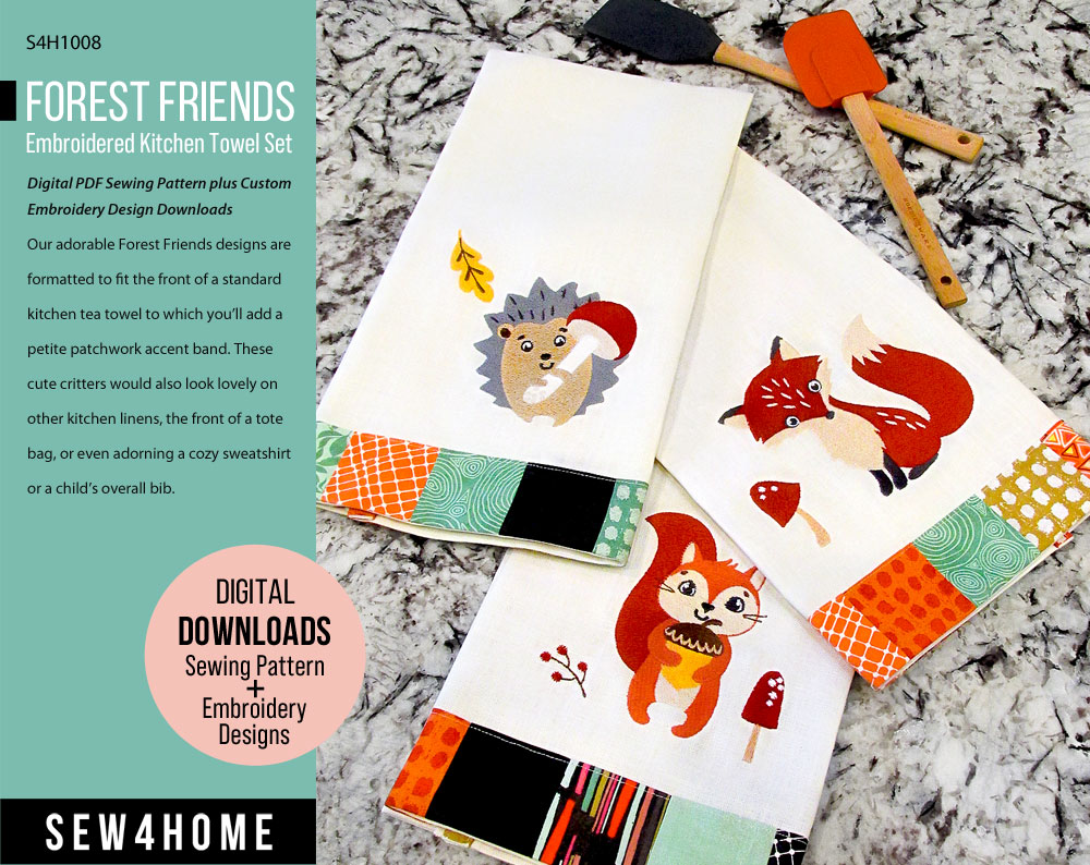 You’ll love the eye-popping colors and detailed embroidery, including those adorable French Knots on the mushrooms. Originally released as part of the Sew4Home Maker’s Club; this pattern set is now available exclusively in the S4H Etsy Shop. Our adorable Forest Friends designs are formatted to fit the front of a standard kitchen tea towel; they range in height from approximately 5″ to 6″.
