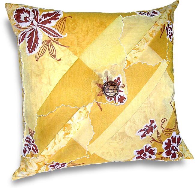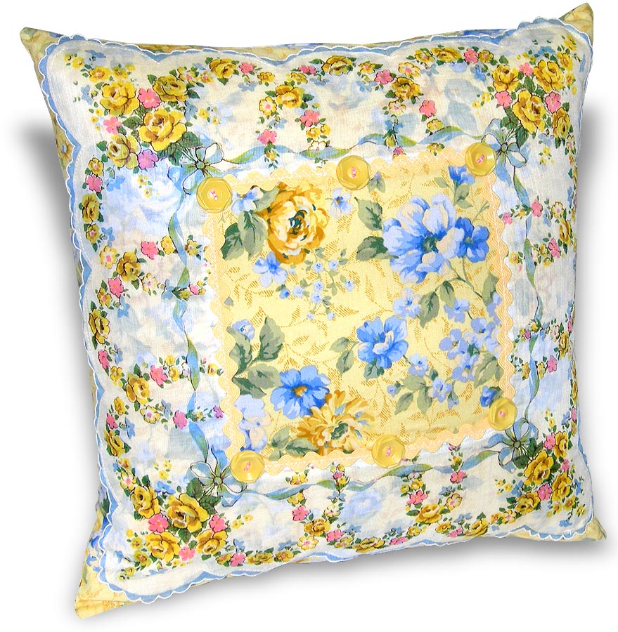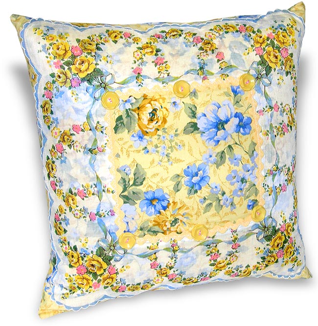This last example is as simple as simple can be. I used the plain hankie as my pillow top with a white piping accent that matched the white highlights on its design.