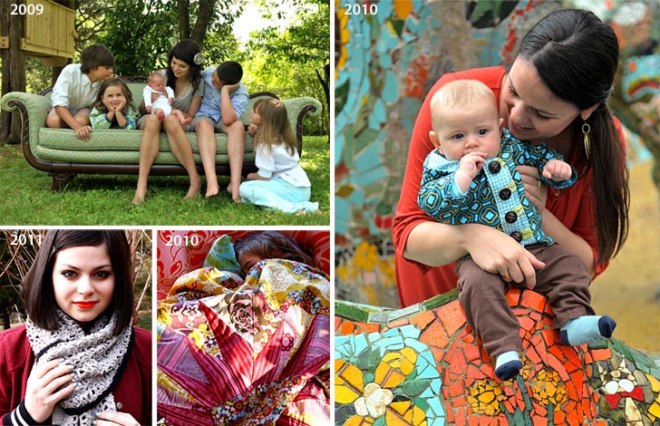 Top left: all six children; bottom left: oldest daughter and frequent model with scarf she crocheted; bottom center: absorbing creativity under one of a houseful of beautiful quilts; right: Anna Maria and youngest son. How could you not develop an appreciation for creativity dressed in such a jaunty jacket?!