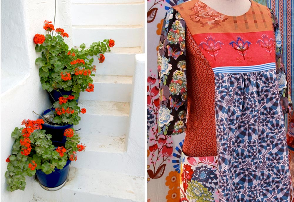 AMH: Earth washed stucco walls, geraniums everywhere, worn stone paths, hand loomed wool blankets, bright floral table linens, needlepoints, crochet flowers. Table scarves, napkins, pillowcases, sheets all enlivened with little embroideries of flowers and trailing motifs. Long black dresses on widows, who manage, however, every now and then on a brighter day, to cover their heads with a floral scarf instead of black. Orange trees, chickens, gypsy weddings in the streets. Herds of sheep walking along a distant mountainside, bells chiming across the wind. Village churches, their architecture in the shape of the cross, modest on the outside yet knock-you-over-breathless on the inside with walls laden in Byzantine mosaic icons depicting the life of Christ, marble, carved wood. The ornate vestments of the priests adorned with symbolism in the regular patterns of the cloth. My ‘Triflora‘ print was inspired by the pervasive design symbolism of the Holy Trinity through many of the textiles used for the church’s beautiful, ritualistic services. Sorry that was all a bit stream of consciousness… I had to close my eyes to do it!