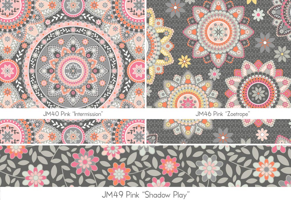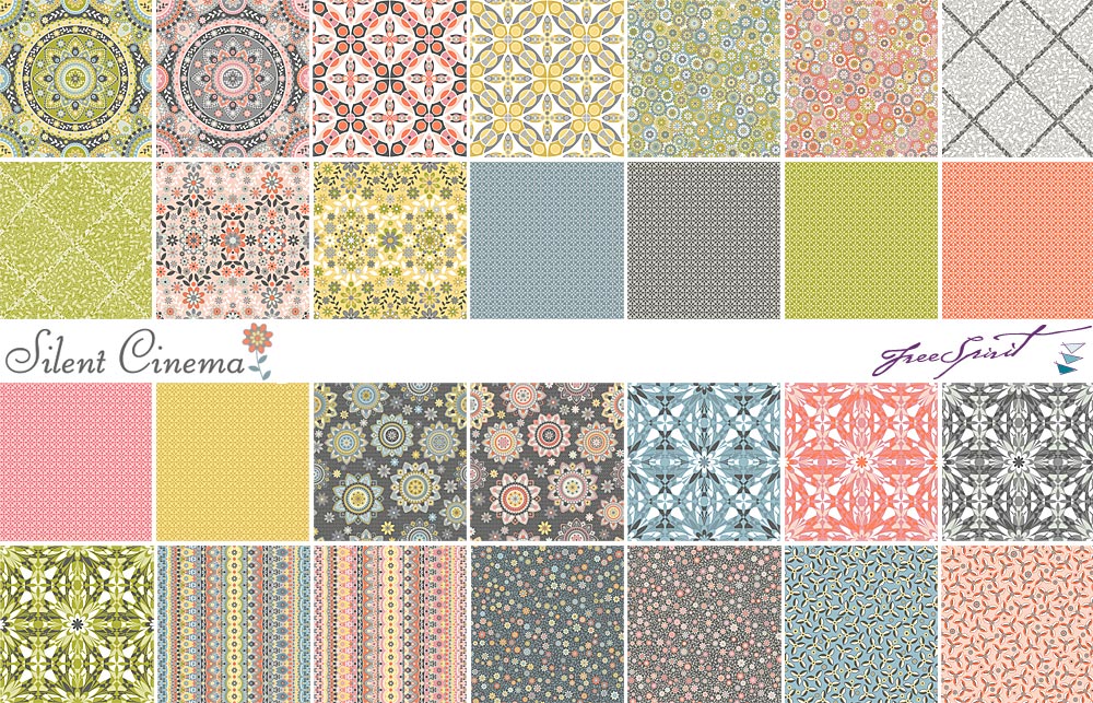 JM: Oh, what a wonderful description… thank you! For a lot of designers, color comes first. For me, the designs come first. And, I generally start creating with bright colors. My trusty standbys are pinks, greens, oranges and yellows. I love these colors! When creating Silent Cinema, I came up with the designs and plugged in my usual colors as I worked, creating the design elements and putting them in repeat form. When the time came to start figuring out the exact colors for the collection, I was inspired to toss in some grays. Then I chose slightly softer shades of the colors I’d originally been working with, and I mixed these with the grays and some muted blues. I’ve done collections that are purely bright and sunny, and I’ve done collections that are completely soft and muted. With Silent Cinema, I wanted to bring these two distinct color worlds into one cohesive collection.