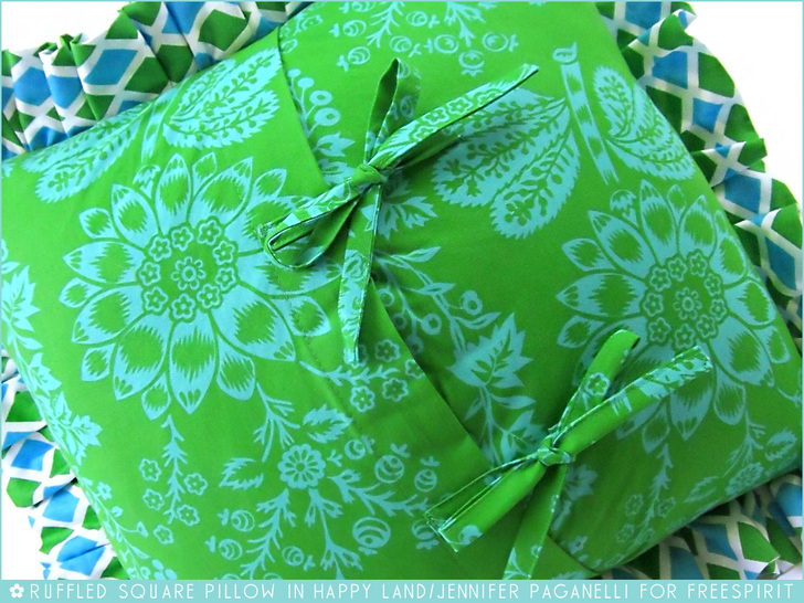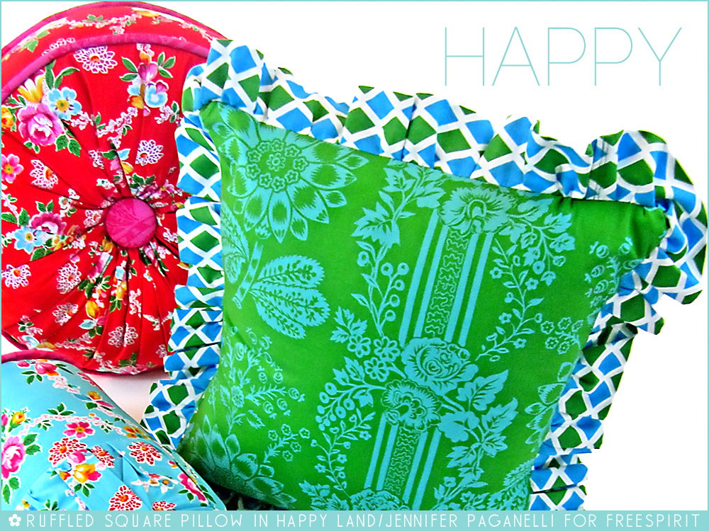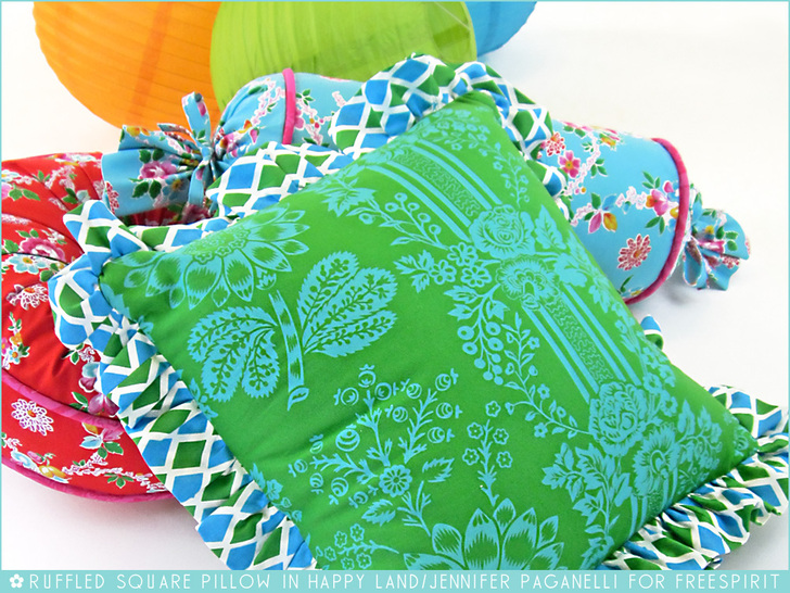 The classic pillow shape is the square. But if that seems a little too, well… square for your home décor happiness project, soften it with a beautiful ruffle. Not only does does a ruffle give your pillow a more interesting shape, it’s also a great way to bring in a second fabric and really make a pillow pop. Today’s hip-to-be-square pillow is the third of our trio in Jennifer Paganelli’s Happy Land collection, part of our 10 Designers & 10 Collections series for FreeSpirit and Rowan Fabrics. The back features a pretty double-bow envelope closure, which means you can pull out the insert and make a new pillow cover whenever the mood strikes you.
