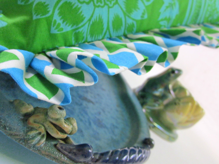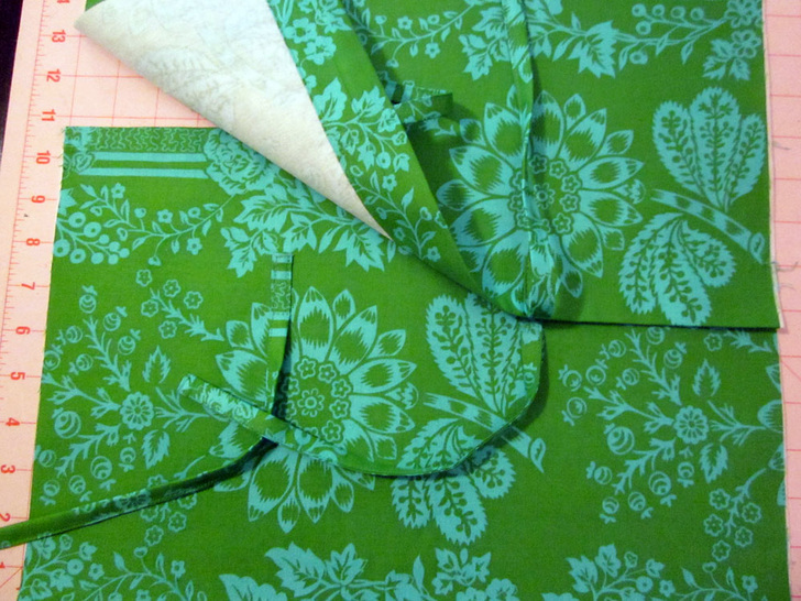- Place your finish back/tie piece on top, right side facing down. Your ruffle and ties are sandwiched in between the layers.