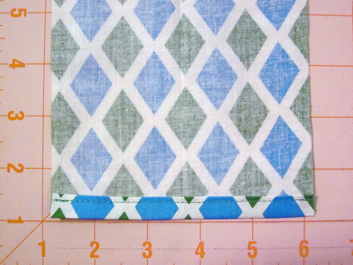 - On the 16½” high x 12″ wide back envelope overlap, make a 3″ hem along the inside 16½” edge (if your fabric is not directional, simply pick one edge to be your inside edge. To do this, fold under the raw edge 1½” and press. Fold under an additional 1½” and press again. Edgestitch along the insdie folded edge to make a clean double turn hem.
