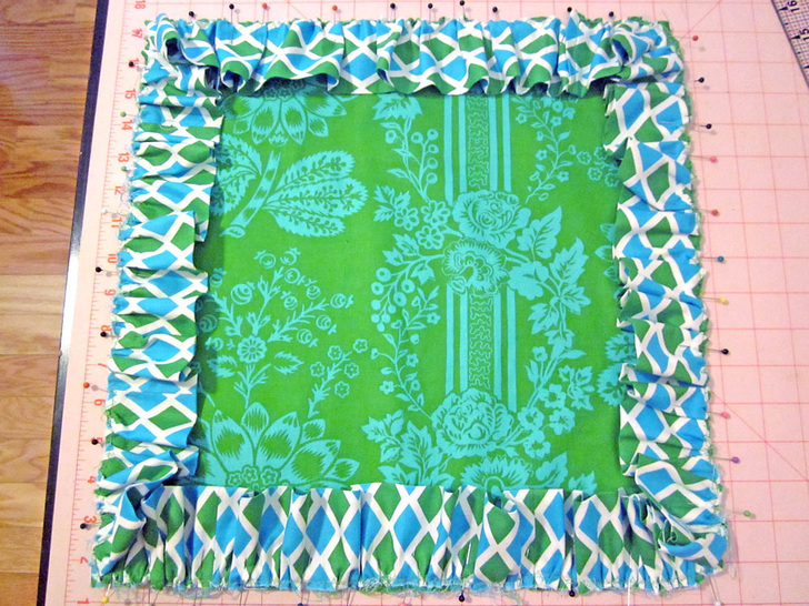 - Starting with the hemmed end at the bottom edge of the pillow, LIGHTLY pin the ruffle strip to the right side of the pillow front square. Align the raw edges of the ruffle with the raw edge of the fabric. You may need to adjust your gathers slightly to fit, but be careful not to pull too hard or you will break the stitching and have to re-ruffle… not fun.