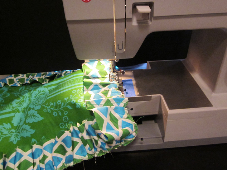 - Cut off the excess so your overlap is about 1″. Un-pin the ruffle, then hem this end in the same manner as you hemmed the beginning. If you’ve used a ruffler attachment, you’ll need to switch back to your regular presser foot.