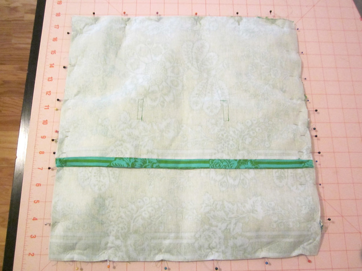 - After hemming, pin the ruffle back on the front of the pillow, overlapping the two finished ends. Pin securely in place this time.