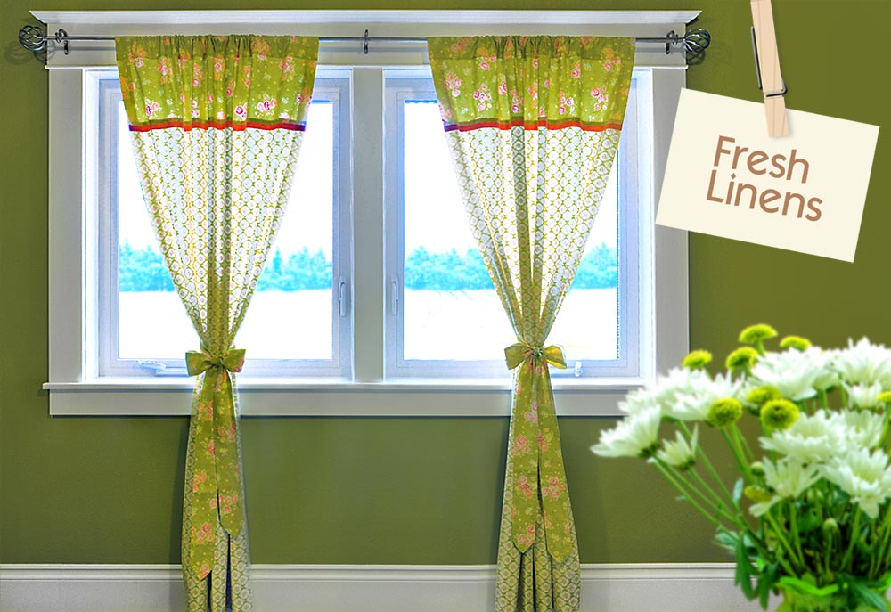 Fresh Linens: Apple Green Panel Curtains with Jelly Roll Accents & Tie-Backs