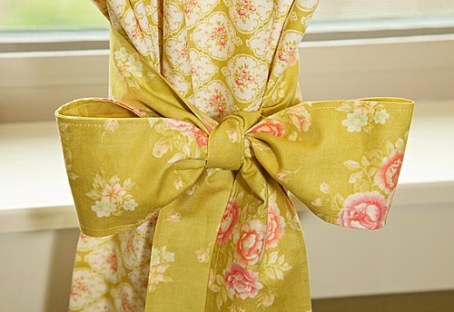 1. We wanted our tie backs wide and extra long so they could be tied into a soft bow with tails that would fall almost to the bottom of the curtain. To accomplish this, we cut two wide strips the width of the fabric (Apple Green Bouquet in our sample).