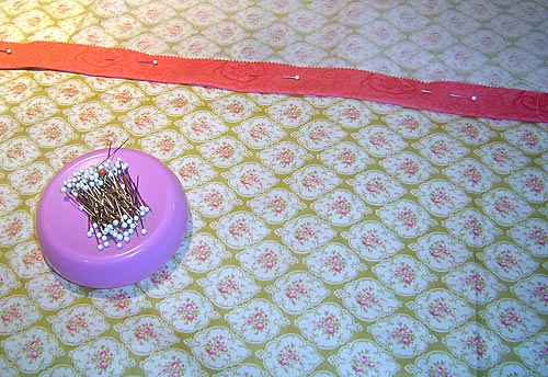 2. Align the raw edges of the folded flange with the top raw edge of the bottom panel fabric. Pin in place.