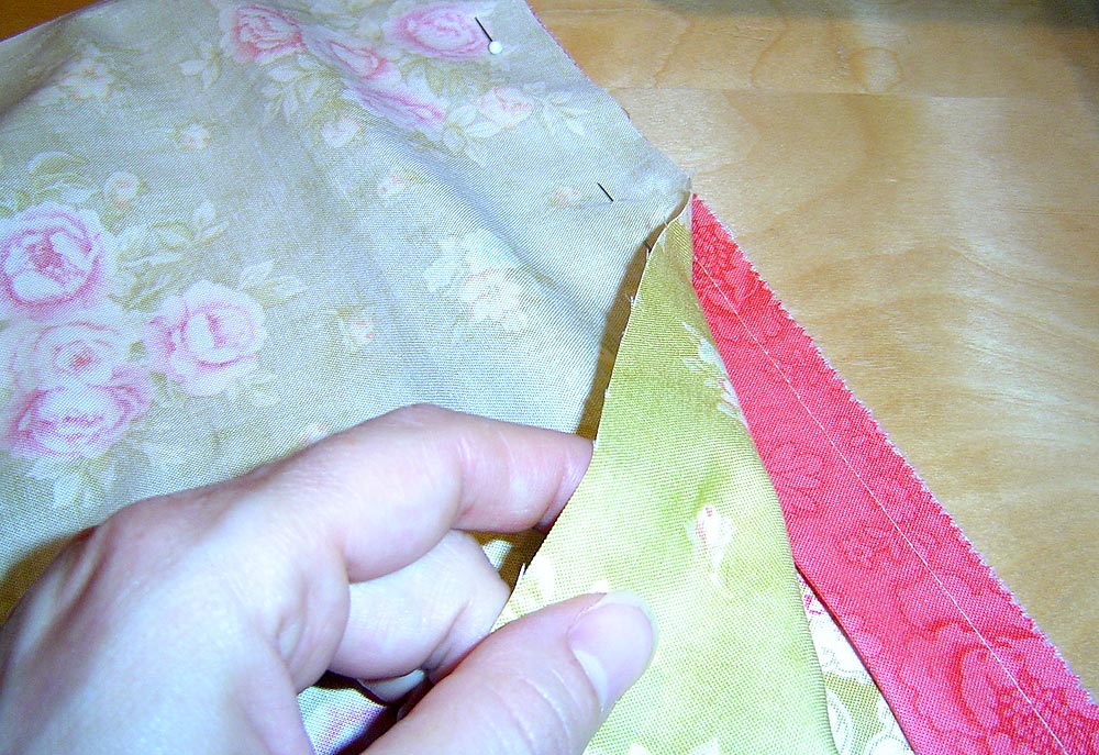10. Turn right side out. Use your finger or a long, blunt-end tool, like a large knitting needle or a chopstick to push out the points. Press. Be sure to press in the raw edges of your opening so they are flush with your sewn seam. Put a few pins along the opening to secure it.