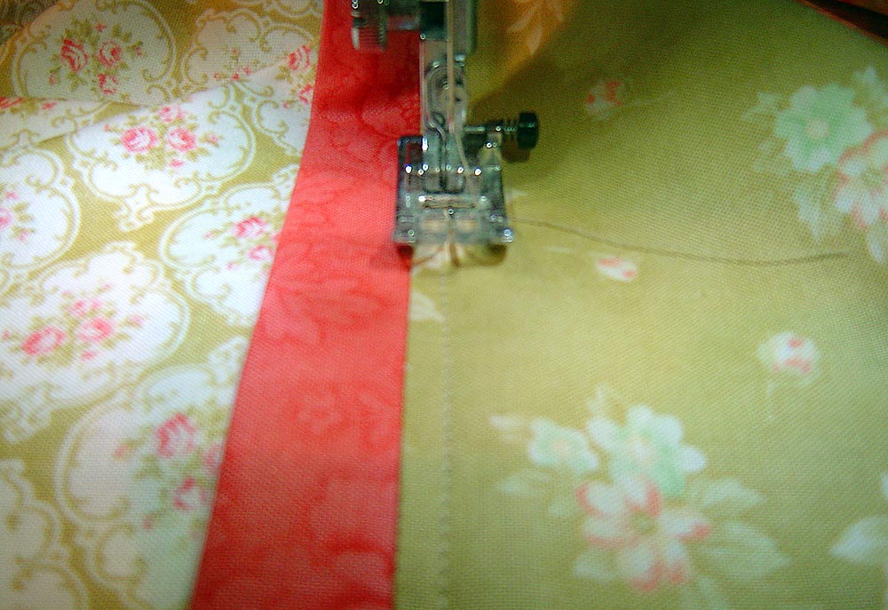 You’ll notice we have what’s called a ‘flange’ in between our top and bottom fabrics. Ours is made our of a pre-cut 2½” strip from a Jelly Roll. It’s basically piping, but without the ‘pipe.’ Our flange overlaps the bottom of the panel and so does not add anything to the overall length measurement.
