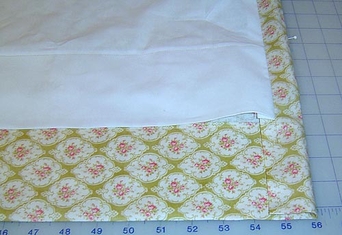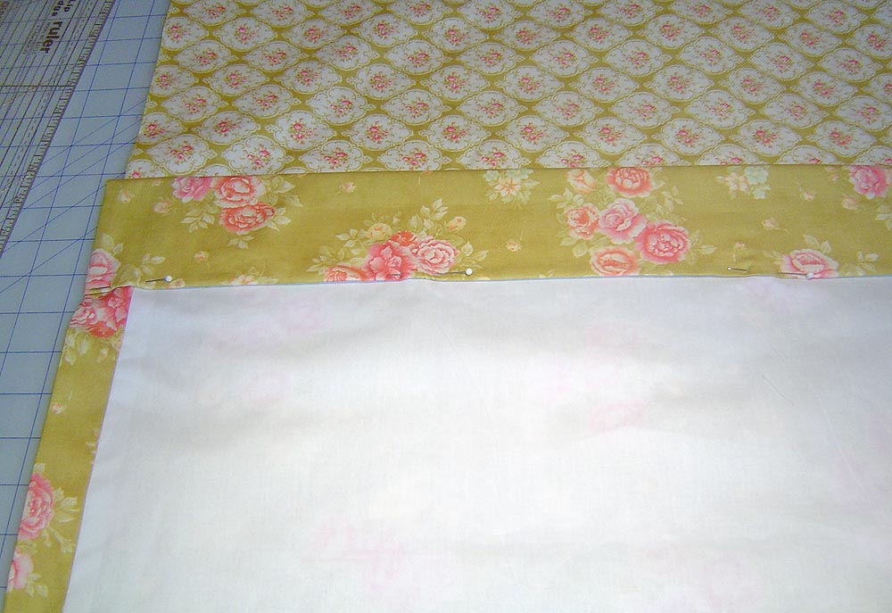 10. Pin one side, starting at the top. Align the top raw edge of the lining with the top raw edge of the top of the panel. Remember, the lining piece is shorter and narrower than the panel piece. Pin in place.