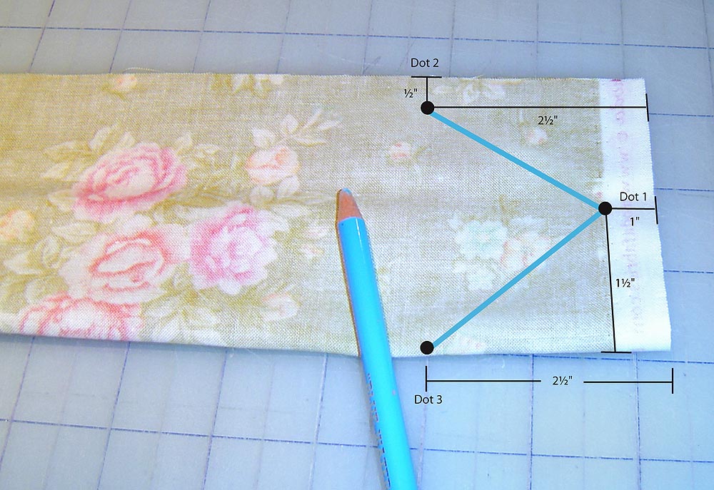 6. Using a fabric marking pen or pencil, draw a gentle point at each end. Place a dot 1″ in from the end and 1½” from the fold (this is the point). Place another dot 2½” in from the end and ½” in from the raw edge. Finally, place a third dot 2½” in from the end right on the folded edge. Now, just connect the dots.