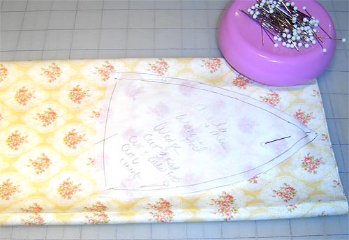 - For the bias strip that creates the ties, you can also make a pattern, mostly so you don’t forget about it! Mark a grain-line on the bias so you remember it needs to be cut this way.