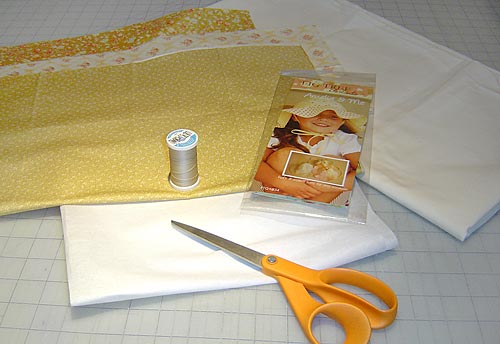 Our sample was made with three Fat Quarter squares: two squares from the Custard colorway for the top and one from the Apple Green colorway for the brim. The lining is done in Bella Solids Ivory. You can use Fat Quarters as we did or collect two ¼ yard coordinating fabrics of your own for the top, ½ yard for the brim and a ½ yard for the lining. If you decide to add ties (we did not), you’ll also need 1/8 yard for the ties. Besides fabric, you’ll also need ½ yard of medium-weight interfacing and a button for the top (optional).