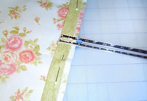 - From the fabric for the trim of the pillowcases (Fleur in Apple Green in our sample), cut two 9″ x 41″ pieces.